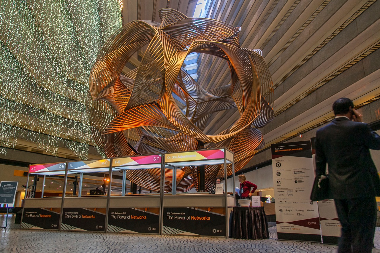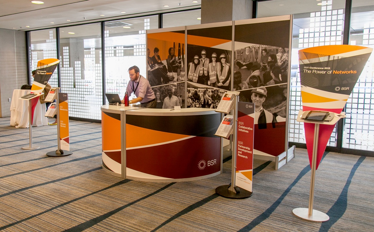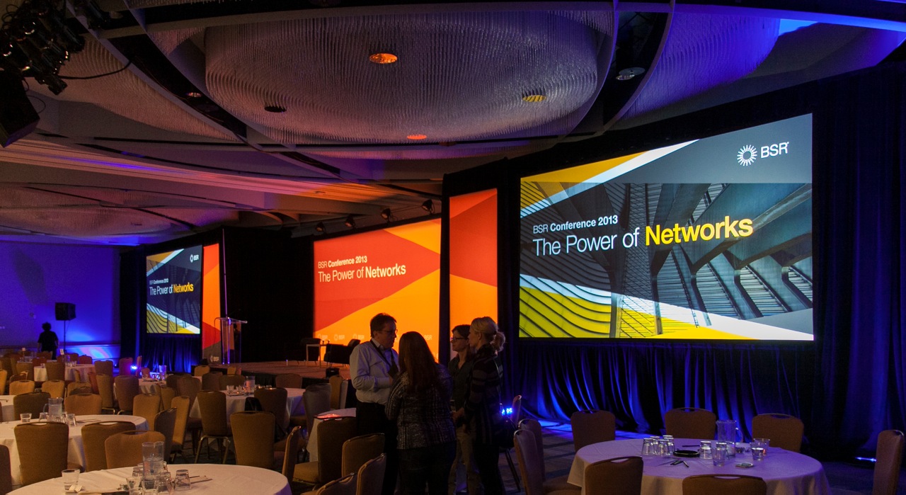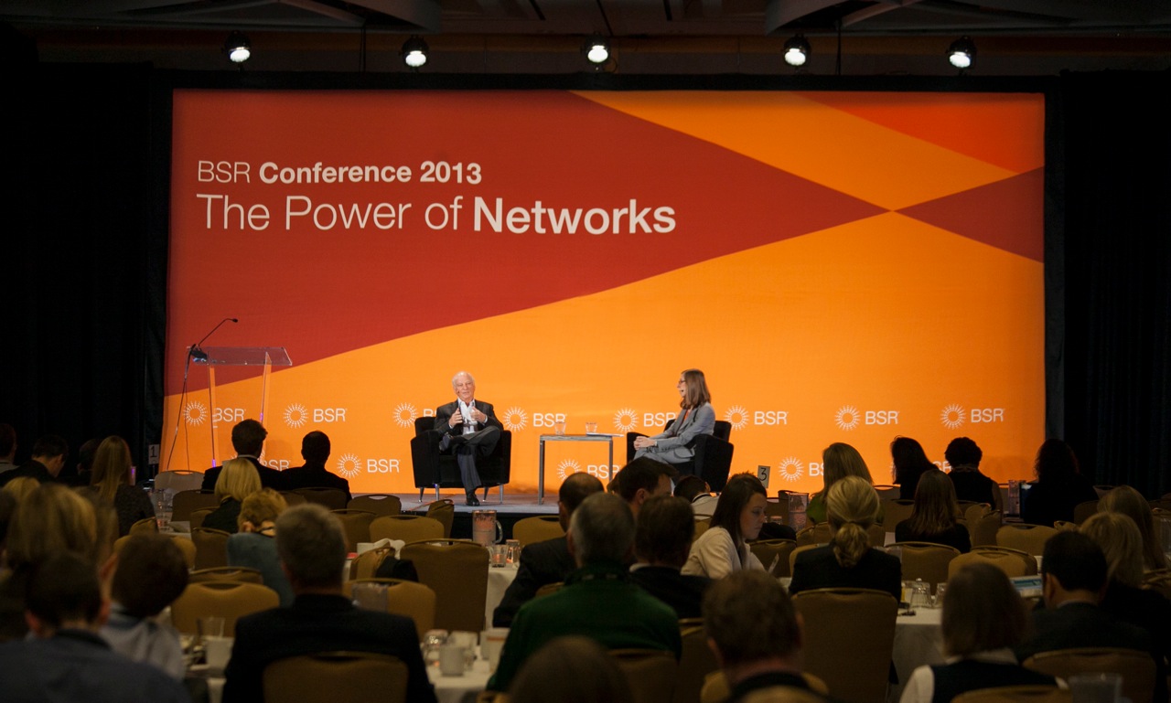 Every year since 1992, the BSR Conference has brought together 1,000 leaders in sustainable business to share their expertise and knowledge. The overarching theme for the 2013 conference was "The Power of Networks." Networks make change happen—multistakeholder networks, social networks, business networks, and more. Abstract photographs that convey the idea of networks were paired with photos of people and organizations that BSR works with. This became the central visual theme of the conference. Overlapping washes of BSR brand colors were used to represent growth, collaboration and movement.
